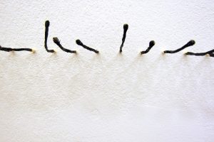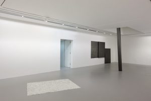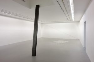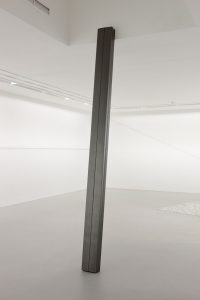 There are two other examples of the artist’s direct use of graphite within this exhibit. Standing at just over three metres, two grey slabs lean up into a skylight hidden in the gallery ceiling. Titled together as Hold (Inherent), these forms of folded paper can be perceived to touch, and where they do not, there is a resulting elliptical light shaft. The light which leaks through is left over from that which illuminates the gallery space, with particular attention shared upon the back wall. On this back wall countless matchsticks have been lined up to make Drawing (horizontal). This wall is the longest in the room and it is presumed that someone has already lit the matches as each one is burnt down to its stick.