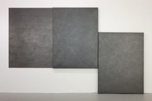 What stands in for these words in the gallery space is a number of pieces which do indeed show use of the materials mentioned. There is graphite used on the wall and on the piece hanging next to it on the same wall. These works are titled Between (cognate #3) and Fascia (structure #66) respectively. There is graphite used also in Fascia (structure #67), which stands up next to these other examples. This third piece which leans up next to the others is covered in paper, and so too is the one hanging nearest to it. The one which uses no paper instead makes its surface the actual wall of the gallery. Each of these pieces is 159 x 119cm. Graphite and diamonds take the same atomic structure, so it’s not surprising that each of these works reveals a metallic sparkle in their finish.
