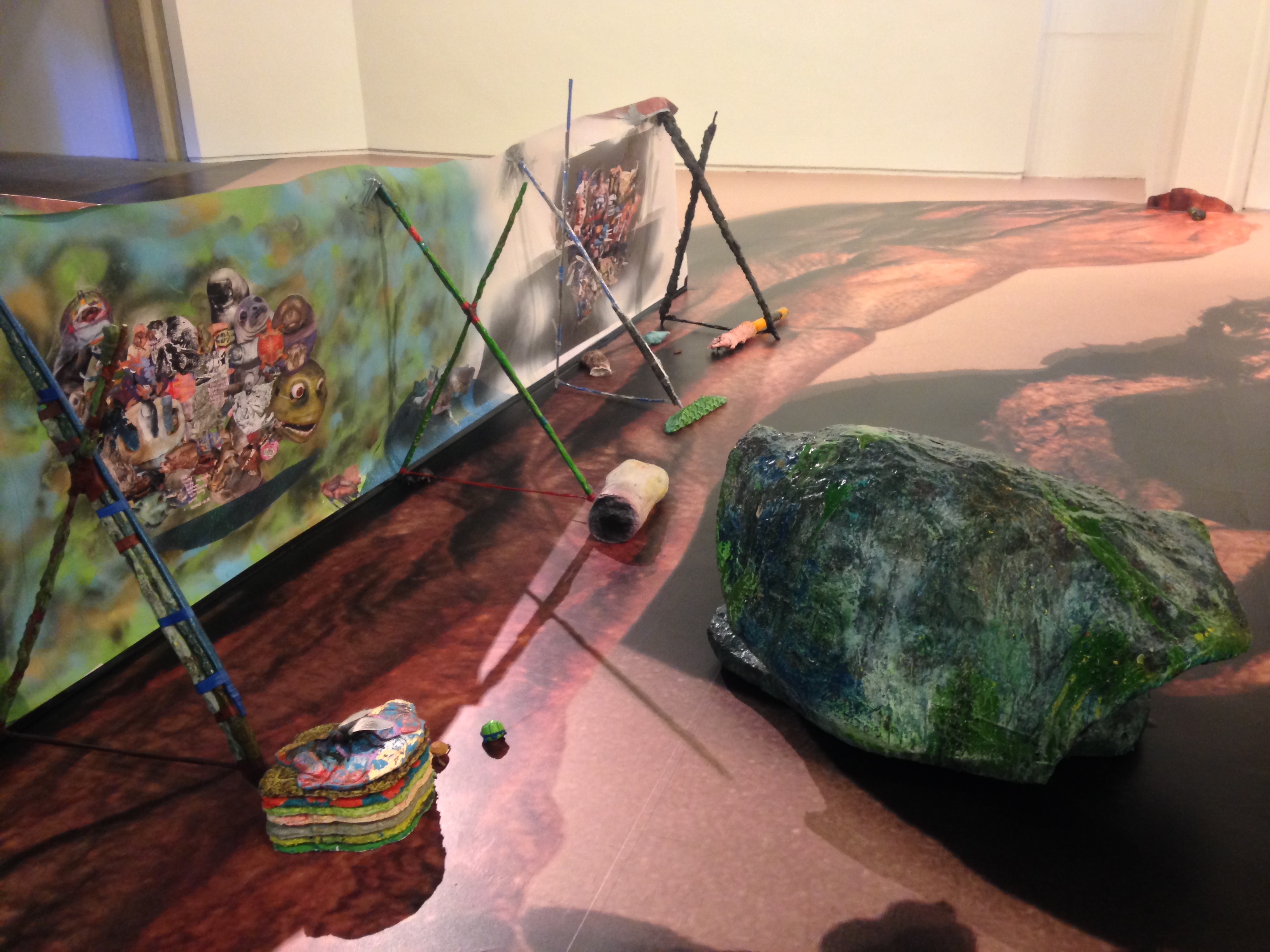 The backs of the upright sections of ‘skin’ reveal clusters of ziney Hirschhorn-esque collages. Bodies and statues and skeletons and knives and family pictures. But mainly bodies. And one cluster is dedicated entirely to turtles. It is collaged imagery by association, of the sorts of things that may occupy the minds of tween-age boys. I’m reminded of the gory 1978 Faces of Death. These cumulative references point primarily at the autopsy of found ancient bodies, the ‘scientific’ manner in which they are displayed and viewed, but also perhaps to the original sacrifice itself. He is revealing his hand, the research is poured into the installation like pigment.
