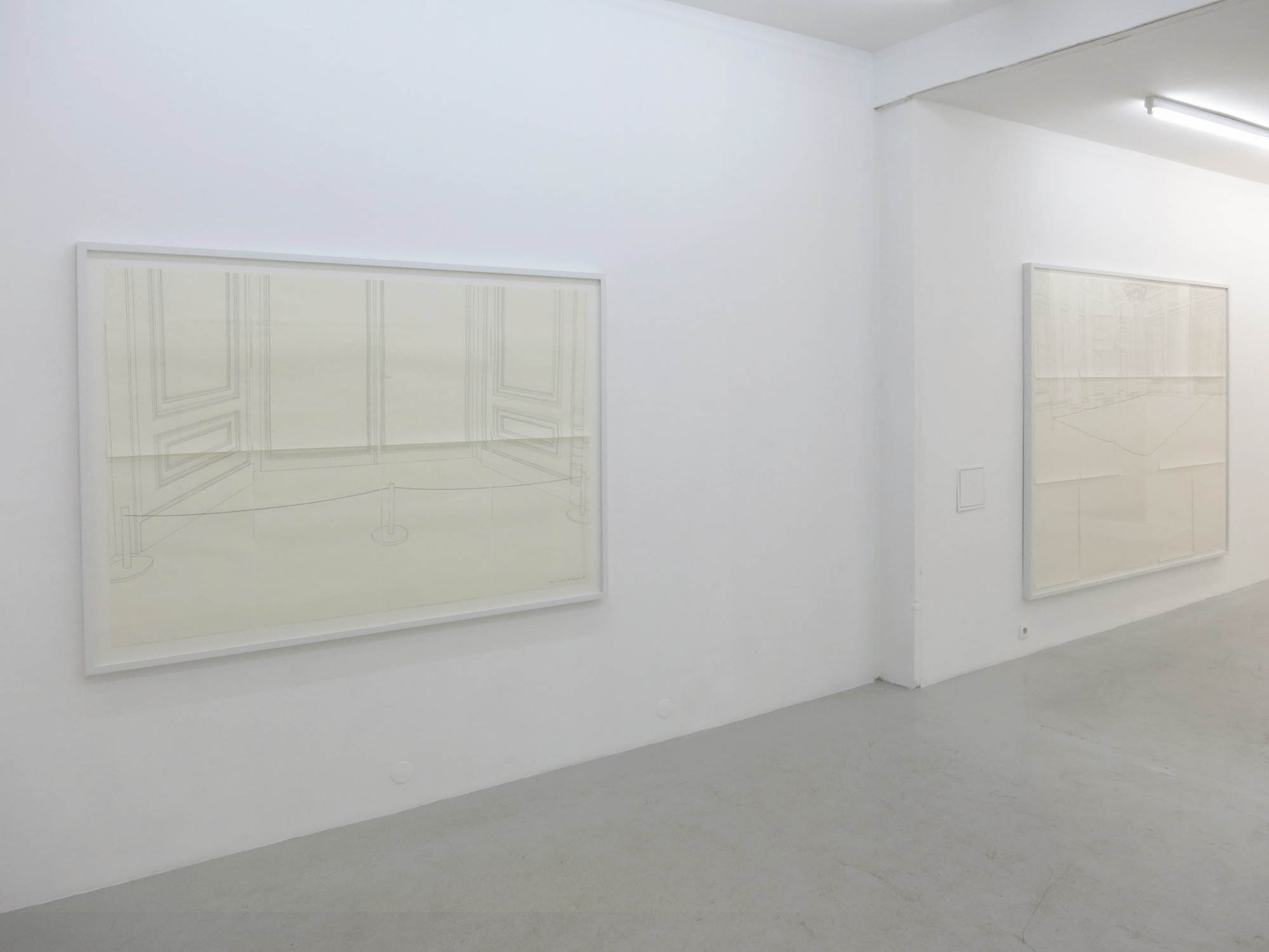 “Precaution principle is a series of drawings in which the precaution lines protecting the sculptures are drawn, contrary to the original sculpture which does not appear on the drawing. These precaution spaces become visible, like starting points of new systems.”